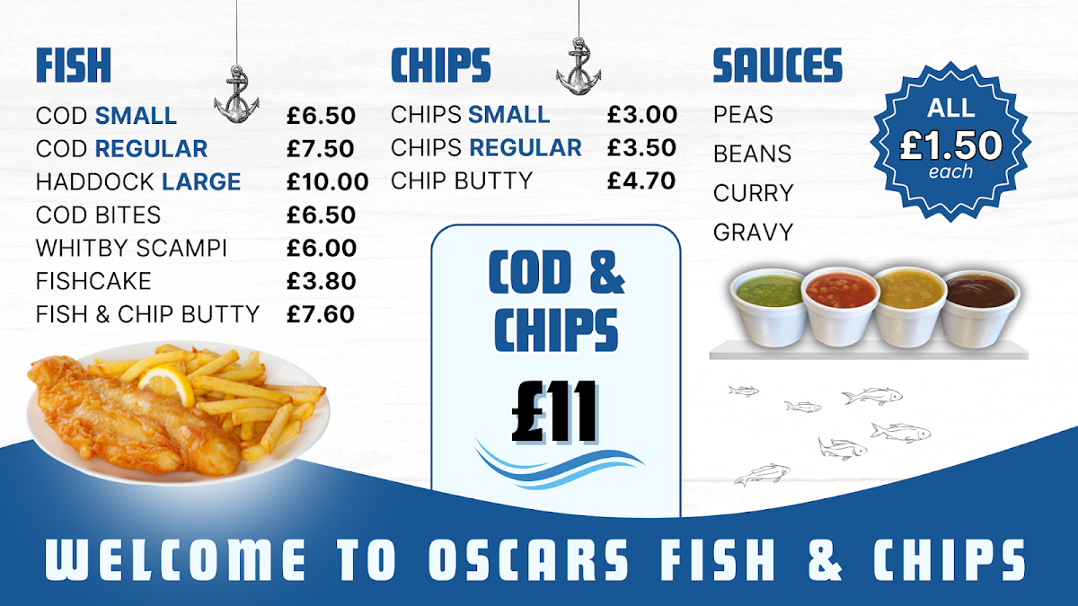 The menu at Oscars Fish & Chips Saltburn is a delightful reflection of classic British comfort food with a focus on fresh and flavorful offerings. Among the standout items is the Fish and Chips, a staple of the British culinary scene. This dish features perfectly battered fish served alongside crispy golden fries, delivering a satisfying and hearty meal. It's a true crowd-pleaser and a must-try for anyone visiting the restaurant.
