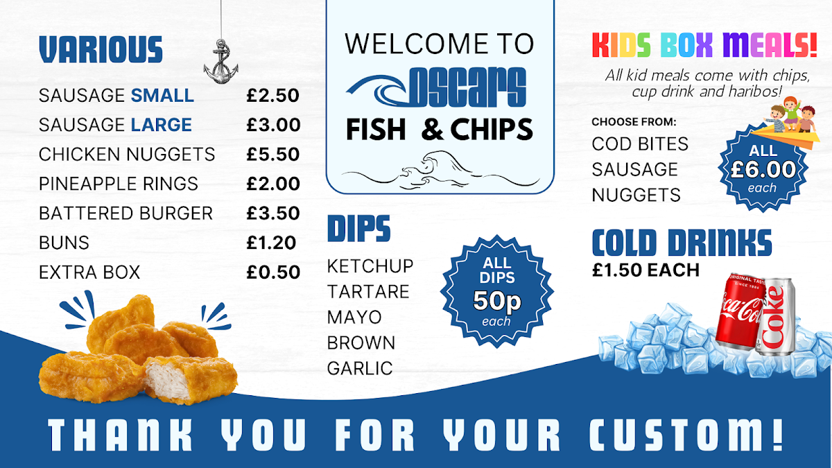 With these choices, Oscars Fish & Chips Saltburn offers a menu full of comforting, well-loved dishes that deliver great taste and value. Whether you're in the mood for the classic Fish and Chips, the crispy Battered Sausage, or the cozy Chip Butty, each dish stands out for its quality and authentic flavors, making it a great spot for a satisfying meal.